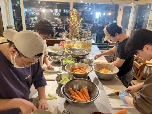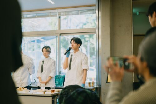 また、今回の大きな挑戦は、「食のこれからを担う学生」と一緒につくるということです。辻調理師専門学校に通う学生6名が企画に参加し、前日には株式会社アンドファームユギの大神さんの畑を訪問。実際に土に触れ、野菜を見て、想いを聞いた上で、当日はこのイベントのためのオリジナル料理を振る舞ってくれました。初めてのことばかりで慌ただしさもありましたが、学生たちの柔軟な発想と、丁寧でとっても美味しい料理の数々に、会場全体が自然と笑顔になり、わくわくする空気に包まれました。